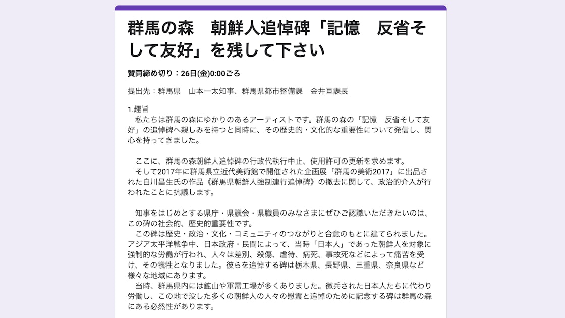 群馬県立近代美術館や群馬県立博物館が位置する、群馬・高崎市の公園「群馬の森」。本公園にある朝鮮人労働者を慰霊する追悼碑が、県による強制代執行により撤去されることに対して、朝鮮人追悼碑存続をのぞむアーティスト有志(飯山由貴・滝あさこ)が呼びかけ人となり、要望書「群馬の森 朝鮮人追悼碑『記憶 反省そして友好』を残して下さい」を作成。賛同者を募り、26日に群馬県の山本一太知事と都市整備課の金井亘課長に宛てて提出した。