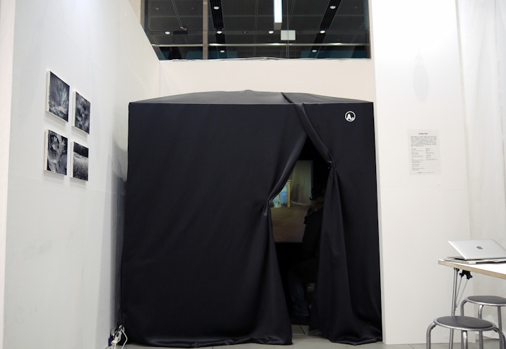 浅草に拠点を置くASAKUSAは、ブースに暗幕で覆われたテントを設置。そのなかでヨシュア・オコン、ポーリン・ボードリ / レナーテ・ロレンツ、ヤコルビ・サッタ―ホワイトの映像作品3点を上映するという異色の展示。映像作品はすべて人種や性的嗜好による差別に言及するもので、「見世物小屋」に象徴されるマイノリティーの存在を、フェアという商業的な場で(隠しながら)見せるという挑発的なものだった。ブースでは「文化的生産と促進における重要な舞台である本会場で、批判的な想像力を通して政治的公正に挑戦する以下の作品をご紹介いたします」(抜粋)という文言が掲げてあり、ギャラリーのアートフェアに対する明確な態度が感じられる。
