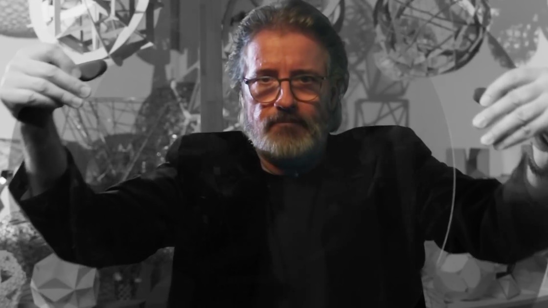 舞台となるエリアソンのスタジオには、幾何学的な模型や照明、鏡が多数見られる。映像のなかでは、回転させると透明と暗闇が交互に現れる偏光板を手にしたふたりが登場。8台のプロジェクターからそれぞれ異なる色合いの光線が投影される光のインスタレーションでは、エリアソンがグーの音楽にあわせて踊りながら、色とりどりの影やシルエットが壁に重なる。