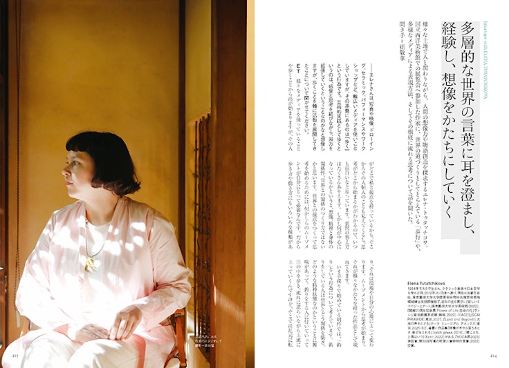 アーティスト・インタビューでは、様々な土地で人と関わりながら、人間の想像力や物語創造を探求するエレナ・トゥタッチコワを取り上げる。国立西洋美術館での展覧会へ参加した作家に、世界の道づくりとしてとらえている「歩行」や、多様なメディアによる表現方法、そしてその根底に流れる思考について、崔敬華が話を聞いた。