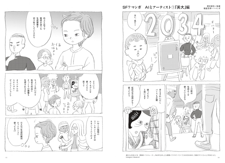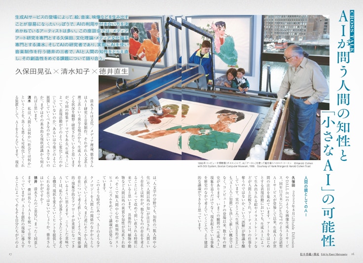 特集コンテンツには、朝倉世界一によるマンガ「AIとアーティスト」や、久保田晃弘×清水知子×徳井直生による座談会、トム・ホワイト、村山悟郎、ジェームズ・ブライドルへのインタビュー、AIと創造性にまつわる年表、生成AIと著作権をめぐる基礎講座なども掲載されている。
