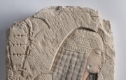 《書記と高官を務めた人物のレリーフ》では、書記があぐらをかいて筆記する姿が描かれている。古代エジプトにおいて、書記はもっとも重要な職業のひとつであり、文字を記録することが人々の生活と密接に結びついていた。また、エジプト美術では横顔や側面が強調されることが多いため、組んだ足と肩が正面からの視点で描かれたこのレリーフは初期の特異な表現として貴重な作品だ。