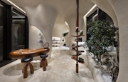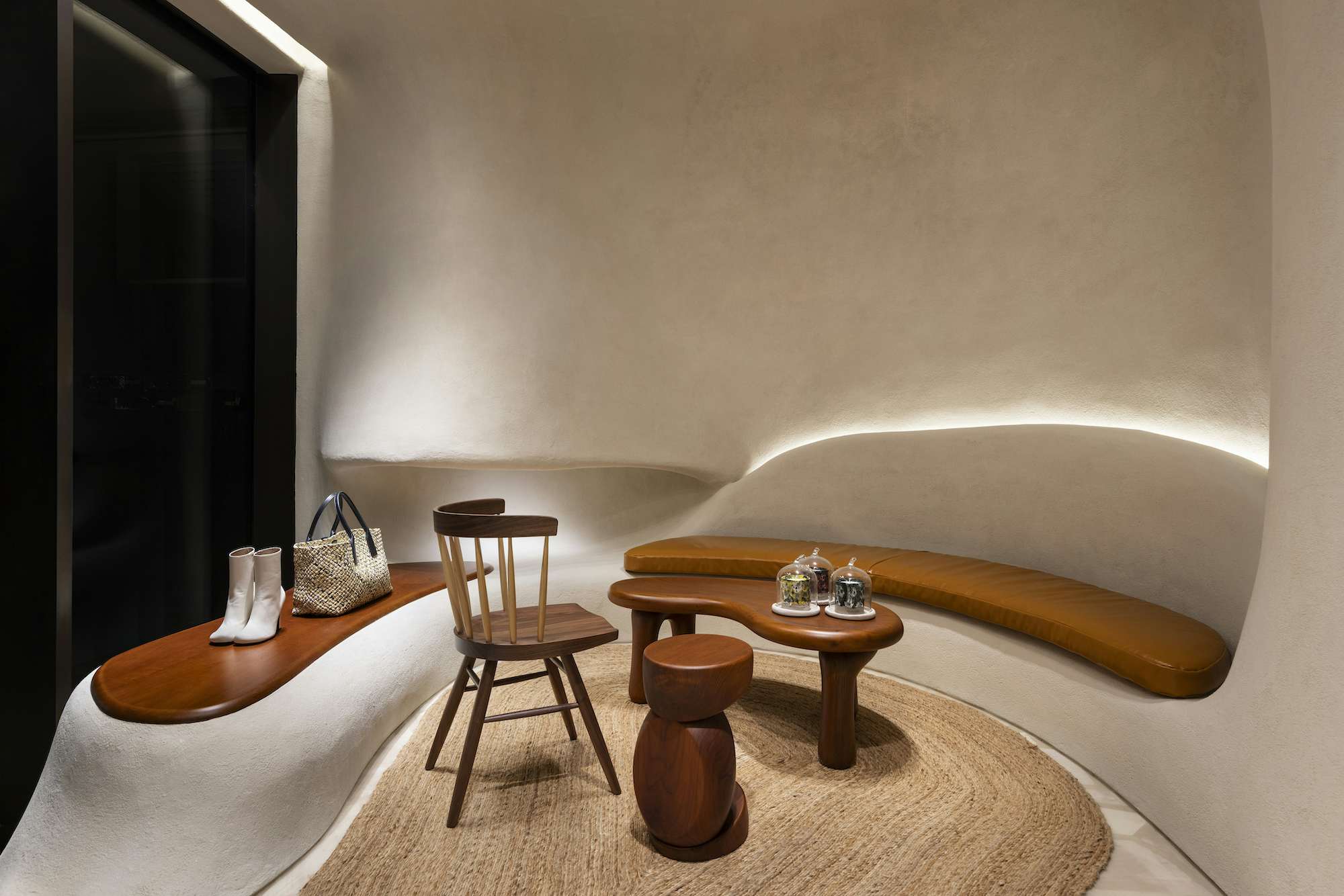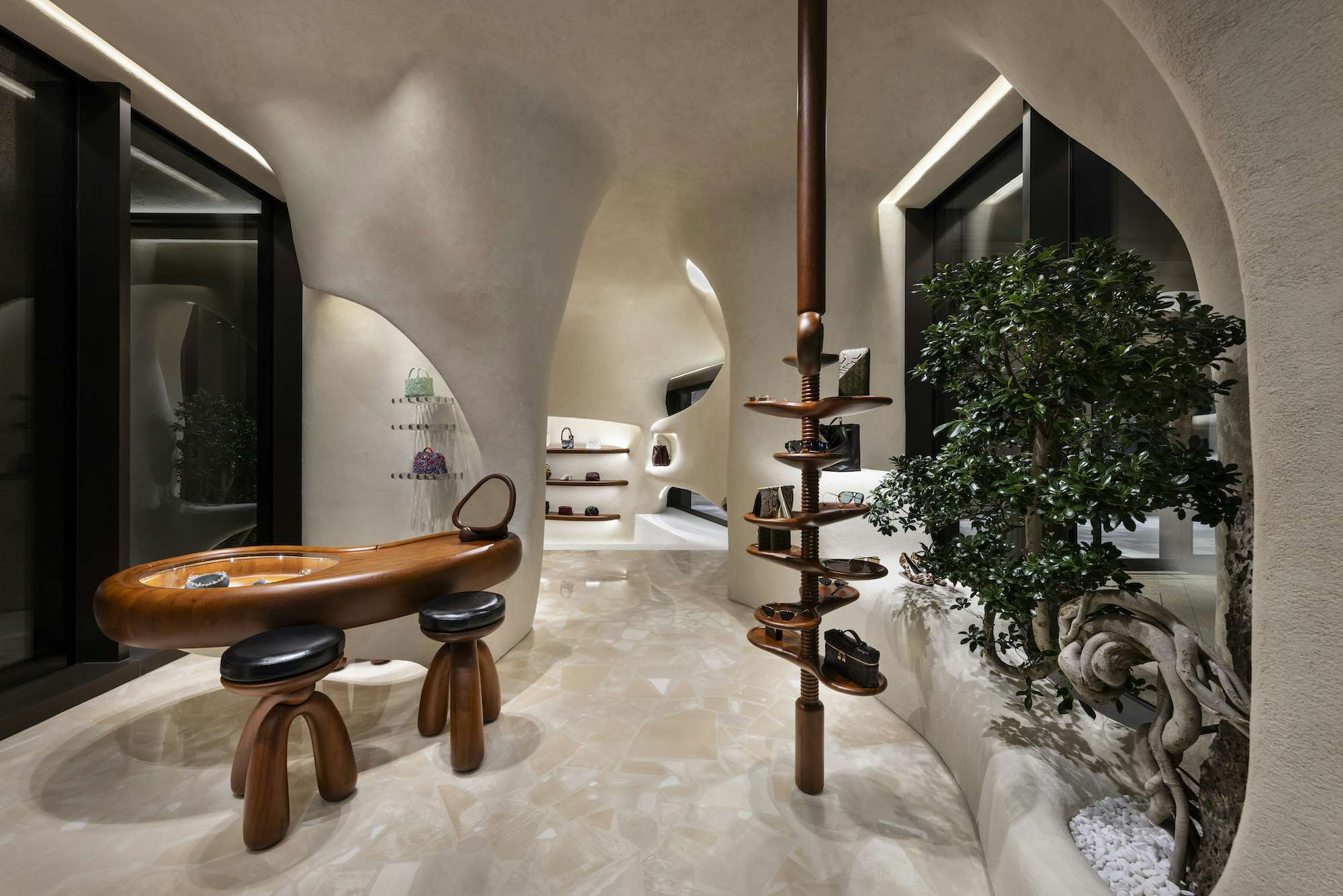 プライベートサロンを備えたこのストアは、デザインもマチュー・ブレイジーによるもの。素材や見た目の美しさなどにおいて、日本とイタリアのクラフトへのオマージュが捧げられている。特徴的な有機的な曲線は、地中海のモダニズム建築から着想を得たものであり、弧を描く壁やアルコーブ、コーナースペースなどはすべて白い漆喰によって仕上げられた。これに対して、棚やハンギングレール、キャビネット、テーブルなどはチーク材が使用されており、空間に、温かみを与えている。