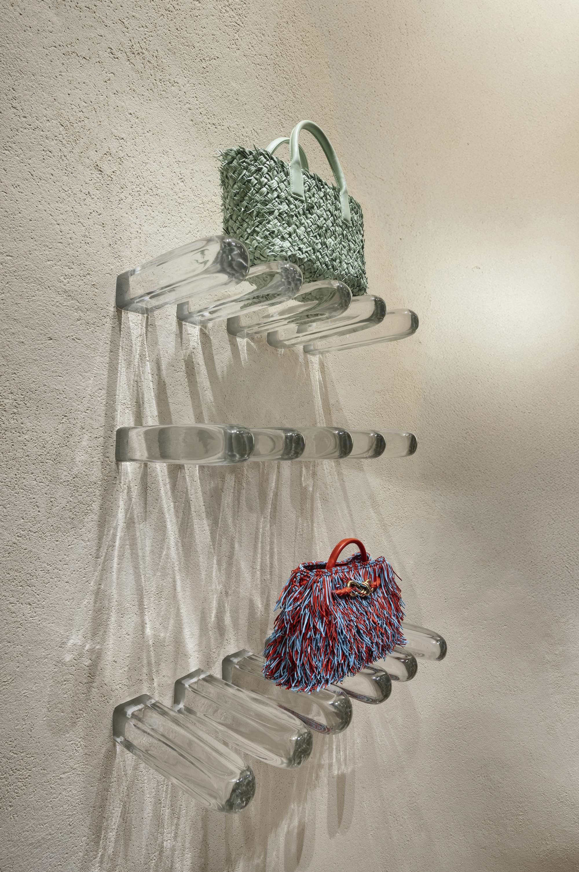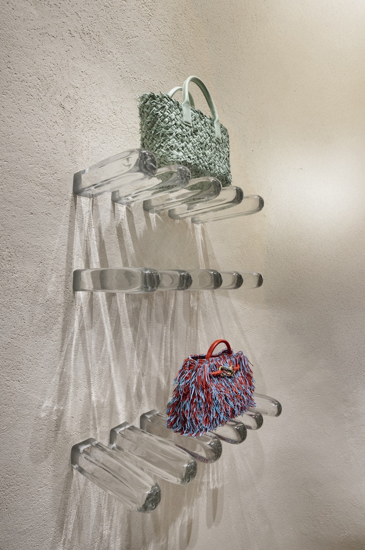 ストアでは、三嶋はこのために制作した、750個のガラスの花をあしらったミラーが大きな存在感を放つ。またガラスのドアノブや棚に用いられた角柱も三嶋による作品。三嶋のヴェネチアン・ガラスが、日本とイタリアの新たなつながりを提示している。