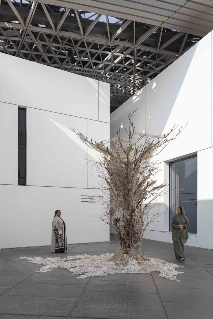 今年の「Louvre Abu Dhabi Art Here」展のキュレーションを担当し、リシャール・ミル・アート・プライズの審査員も務めるのは、スイスと日本のバックグラウンドを持つキュレーターであり編集者であるソフィー・麻由子・アルニ。「影」というテーマは、谷崎潤一郎の『陰影礼賛』からインスパイアされているという。日本の伝統的な「障子」やアラブ首長国連邦の「マシュラビーヤ窓」など、光を柔らかく拡散させる建築的要素を反映しながら、オアシスの椰子の木陰に見える影から着想を得たルーヴル・アブダビのドームとも共鳴している。