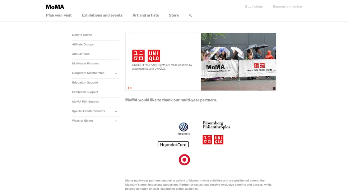 ユニクロは2013年5月以降、毎週金曜日16時から20時までのニューヨーク近代美術館(以下MoMA)の入館料を無料にするプログラム「ユニクロ・フリー・フライデー・ナイト」のスポンサーとして活動してきたが、今後もこのパートナーシップは継続されることとなった。