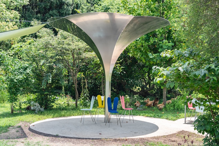 「HANA」は、植物園のランドスケープと呼応する、花のようなかたちをした2つのパビリオンで、「みんなで集まれる」場所をつくり出す。厚さ3mmのステンレスの板材を曲げ加工し、船で犬島に運び込んだ後、現場で溶接、研磨を施した。鈍い鏡面仕上げが、周りに広がっている木々や花、夕日の光など、日々変化する植物園の風景を映し出す。