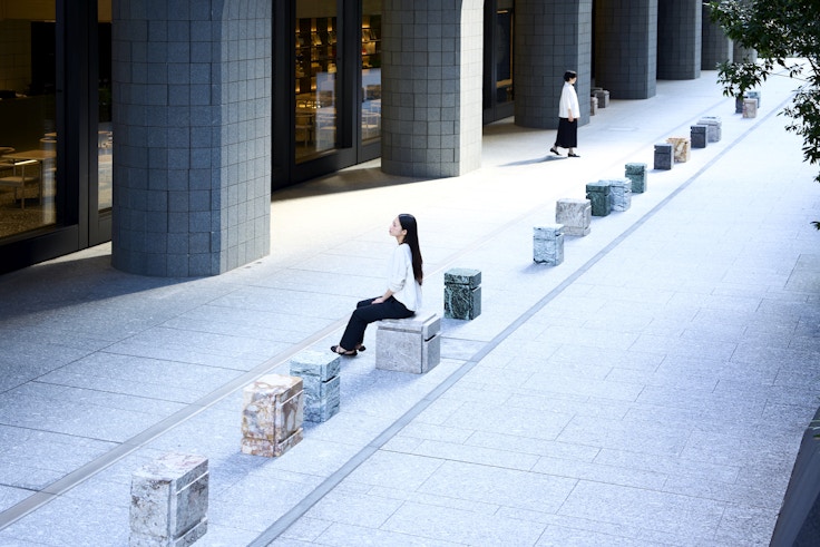《Artizon Conversations》は、椅子の座面と脚の「間(あいだ)」にある空間=ネガティブ・スペースを型取りし、大理石で制作されたインスタレーション作品。日本国内で採取された希少な大理石を素材としており、同作家の代表作《Untitled (One Hundred Spaces)》(1995)から続くシリーズの最新作にあたる。シリーズ作品としては初めて、恒久的に公共空間に展示される点でも注目される。