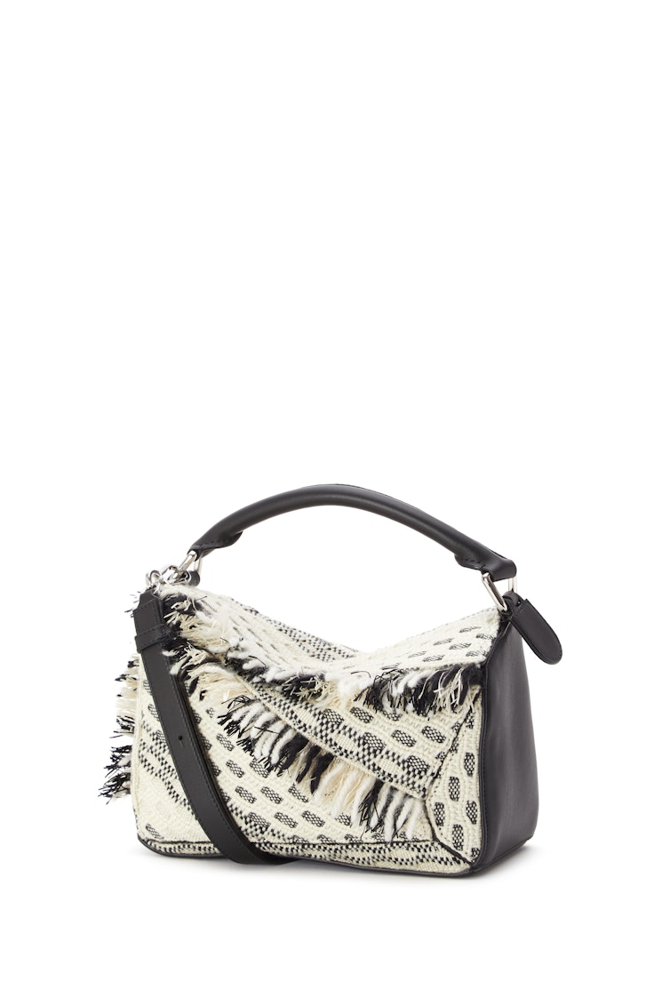 ロエベはアニの二次元の複雑な生地をロエベのフィルターを通して三次元のレザーバッグに落とし込むために、厚みやテクスチャーに取り組むことからスタート。アニの熟練した織りを尊重するため、生地はすべて部分的に手作りにこだわった。手作業で「ドット」を織りに加えたり、ねじれを組み込んだりすることで、彼女のタペストリーの重要な要素であるグラデーション、鮮やかな色のブレンド、小さなタッチまで、作品に完璧にマッチするように研究を重ねて再現されたという。今回のコレクションでは、4点の作品と無題のテキスタイルサンプルが参照元となっている。