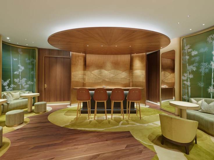 3階は、時代を超えて愛される「トリニティ」リングを着想源に、曲線が織りなすモチーフで表現された天井が優雅な雰囲気を醸し出す。特徴的なのは五感を満たす特別な空間「ジャルダン」だ。竹が描かれた深いグリーンの壁苔庭のようなカーペットなどが、この場所を極上の寛ぎの空間にしている。