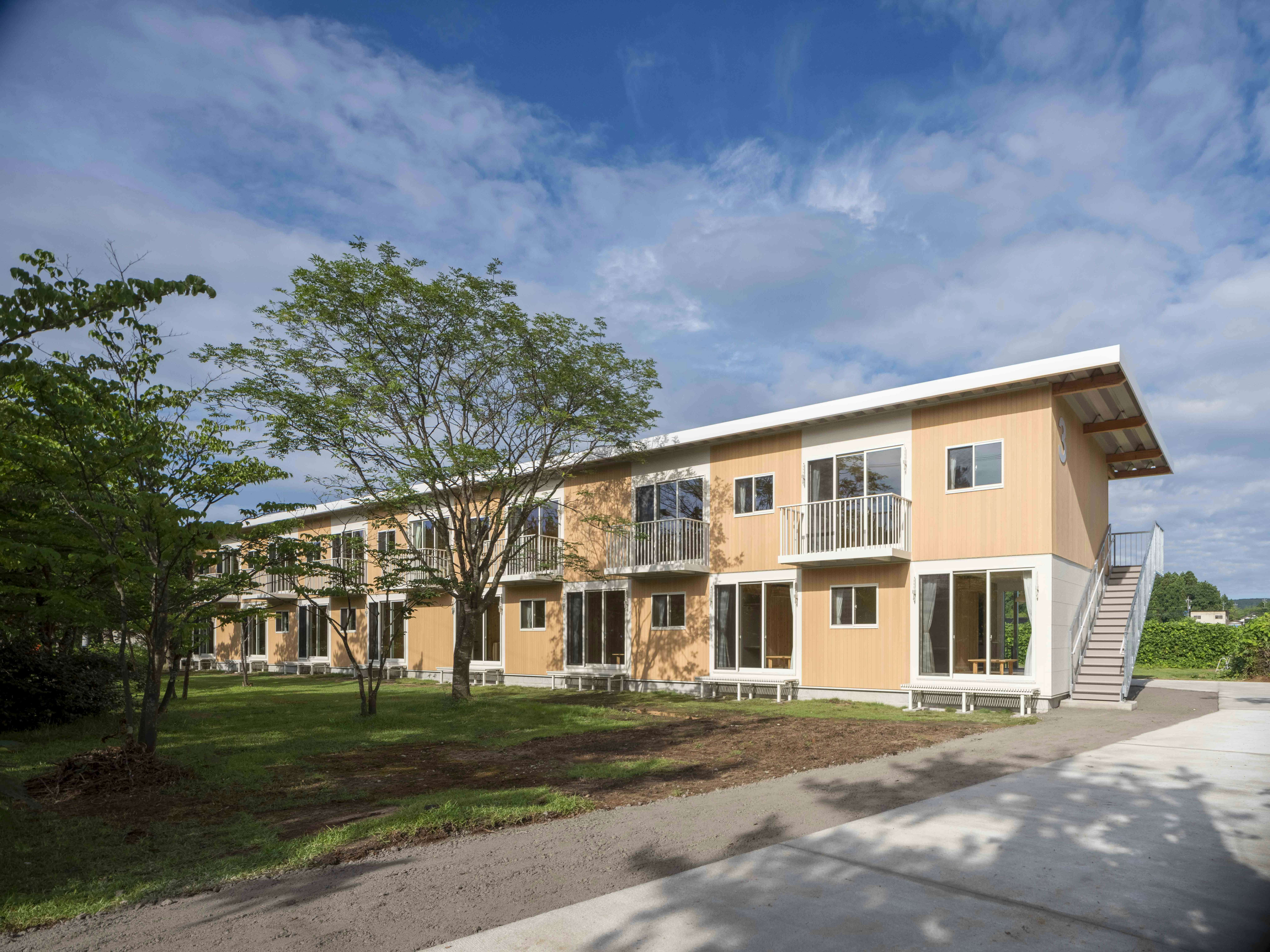 このプロジェクトは、建築家・坂茂(1957〜)が代表を務める坂茂建築設計によるもの。木材に穴をあけて並べたものに木ダボを差し込み、接着剤を使わずにパネル化したDLT(Dowel Laminated Timber)を、箱型のユニットにして積み上げることで工期を短縮。これまでに珠洲市と輪島市において計12棟・166世帯分の2階建て仮設住宅を建設した。東北大震災での支援経験を含め、多くの災害への建築的対応を実践してきた坂。これまでの知見を踏まえた、効率的かつ被災者にとって安心感のある空間づくりが高く評価された。