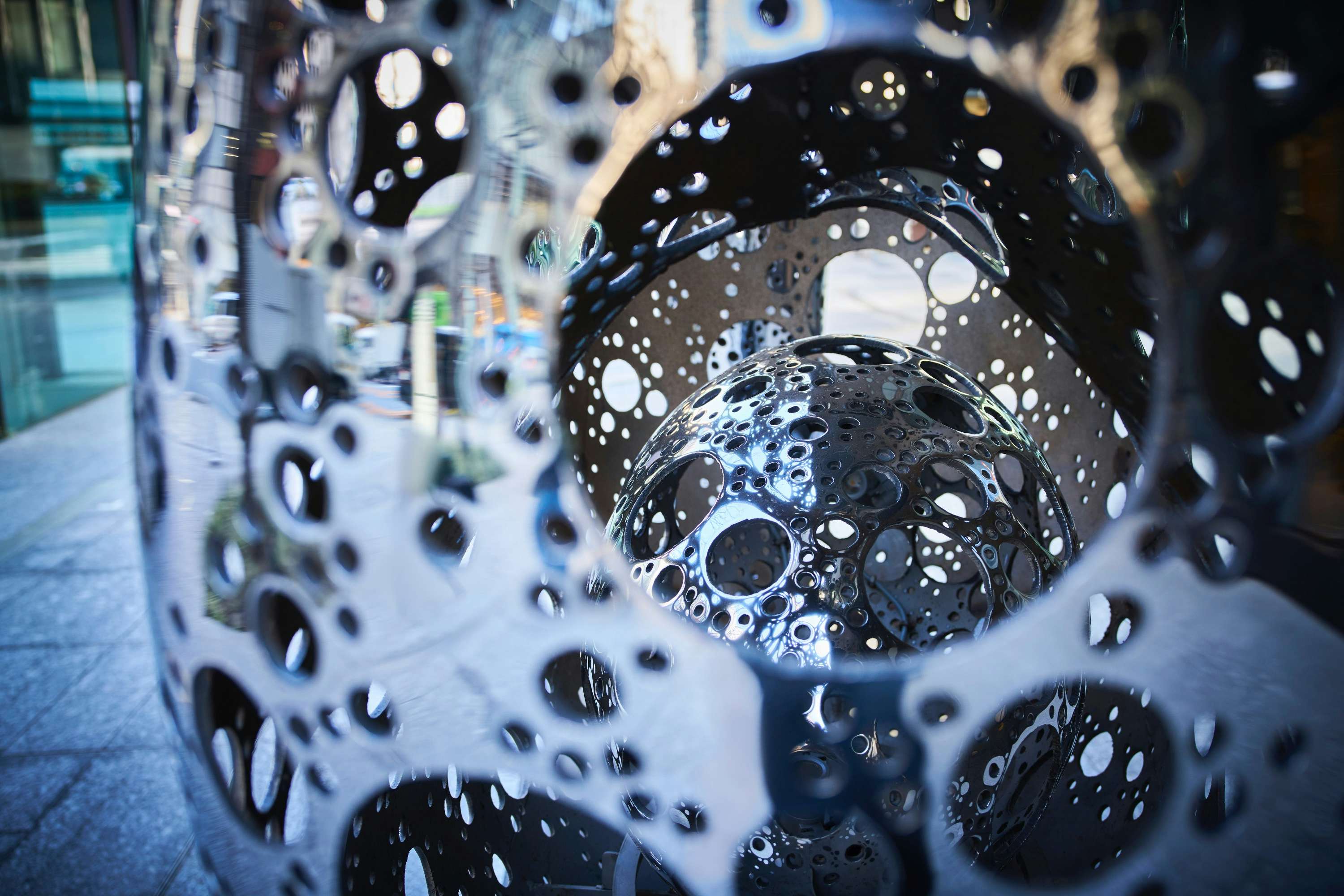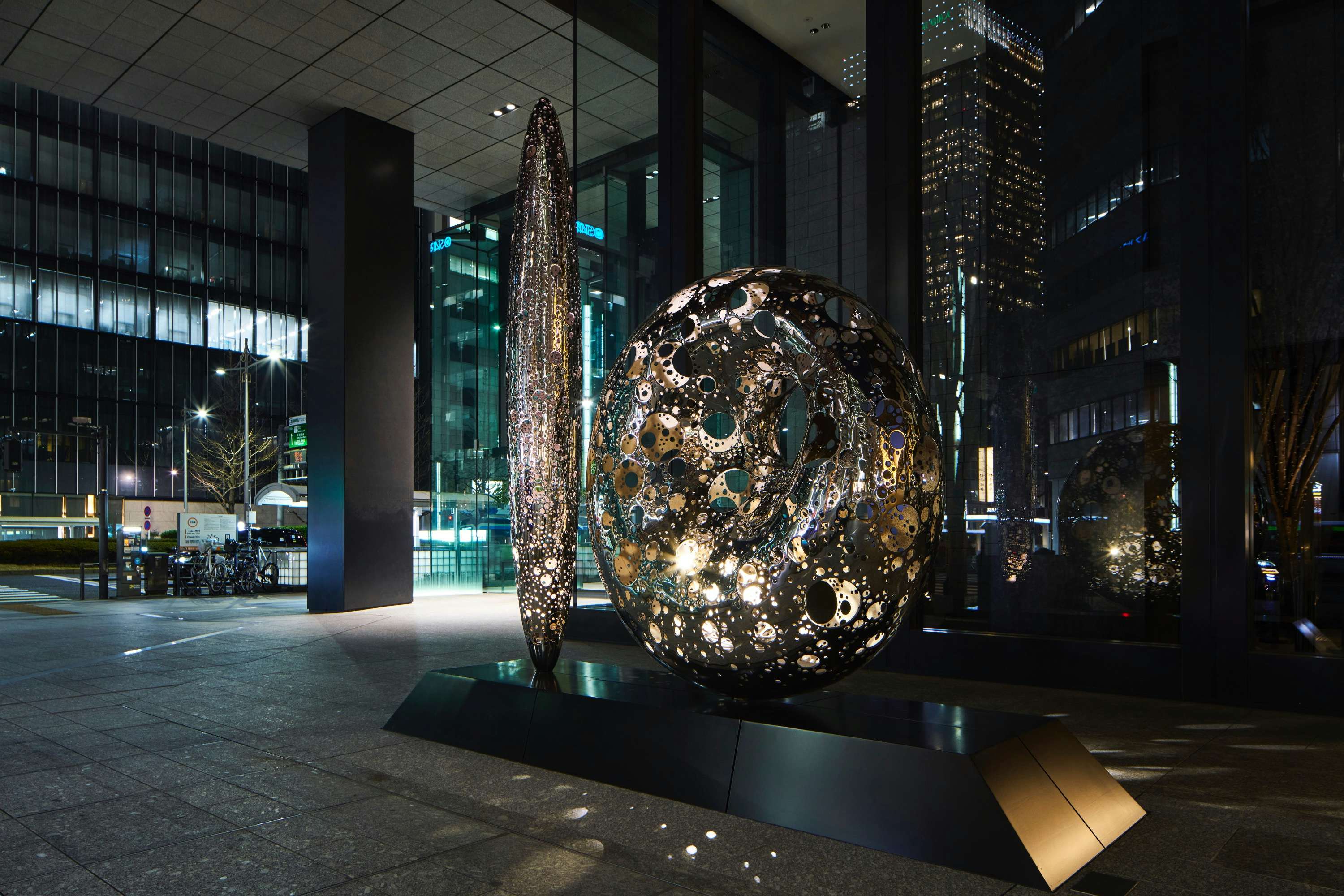 今回設置された《無数の星座がうまれる》は、昼と夜で異なる表情をみせる。磨かれたステンレスの表面は、周囲の景色や見るものの姿を映し込み日常に溶け込むいっぽう、夜になると内部から放たれる光が無数の穴を通じて外へこぼれ、まるで何かが息づいているかのような空間が立ち現れる。