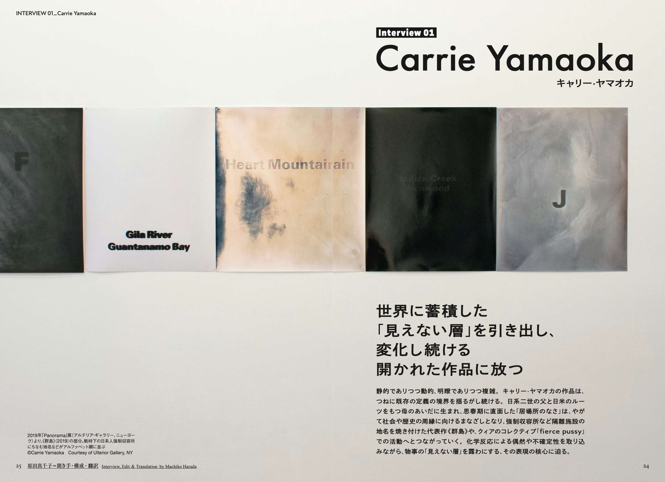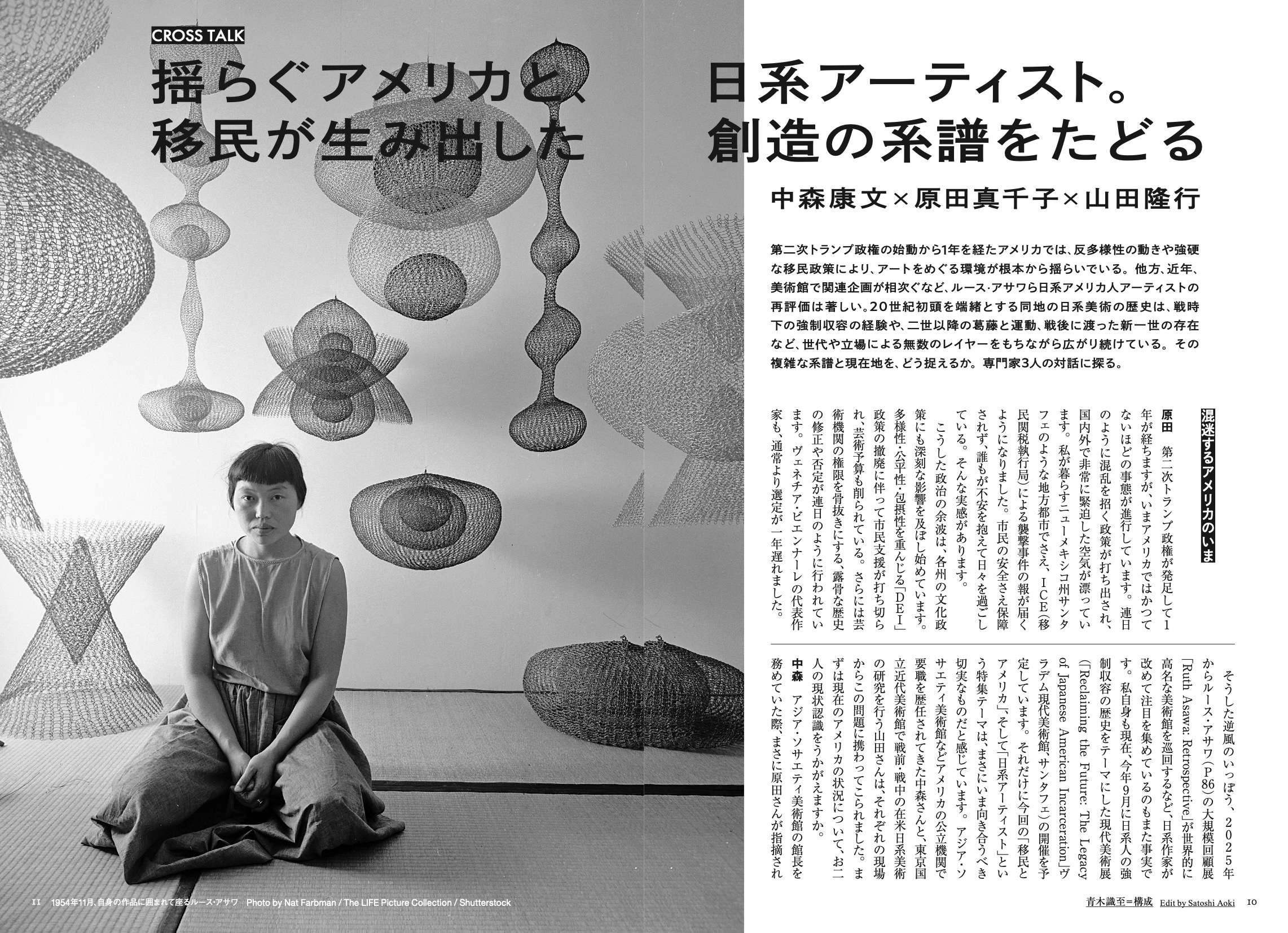 本特集では、専門家による座談会、現在活躍する日系アーティストへのインタビュー、アメリカでの日系アーティストの歴史を振り返る記事、研究者やキュレーターへの取材や論考など多角的な視点から、日米両国の境界で作品をつくり続ける作家の実像に迫る。そして、アメリカの日系アーティストたちがたどった歴史と表現の現在を通して、「移民の国」アメリカとはなにか、また移民やディアスポラという視点から語られる表現の可能性について考える。