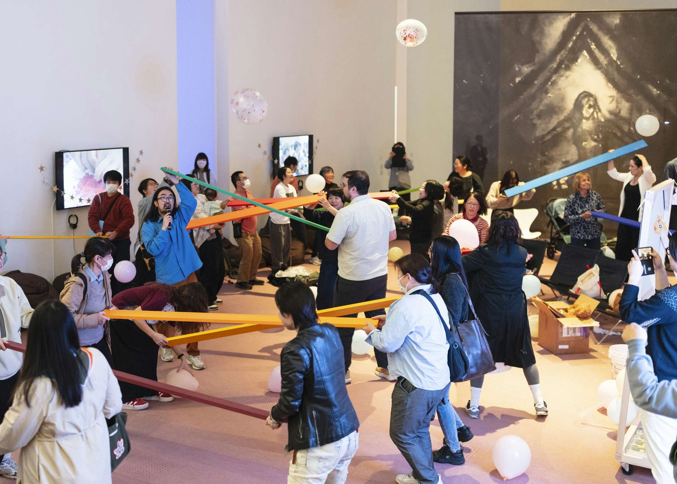 来館者はまず、ミラーレンズのサングラスをかけ、色とりどりのベビー服を着た様々な肌の色の赤ちゃん人形200体に迎えられる。本展は、来館者が赤ちゃんをケアしながら多彩なコラボレーターの作品を鑑賞する、観客参加型の作品だ。