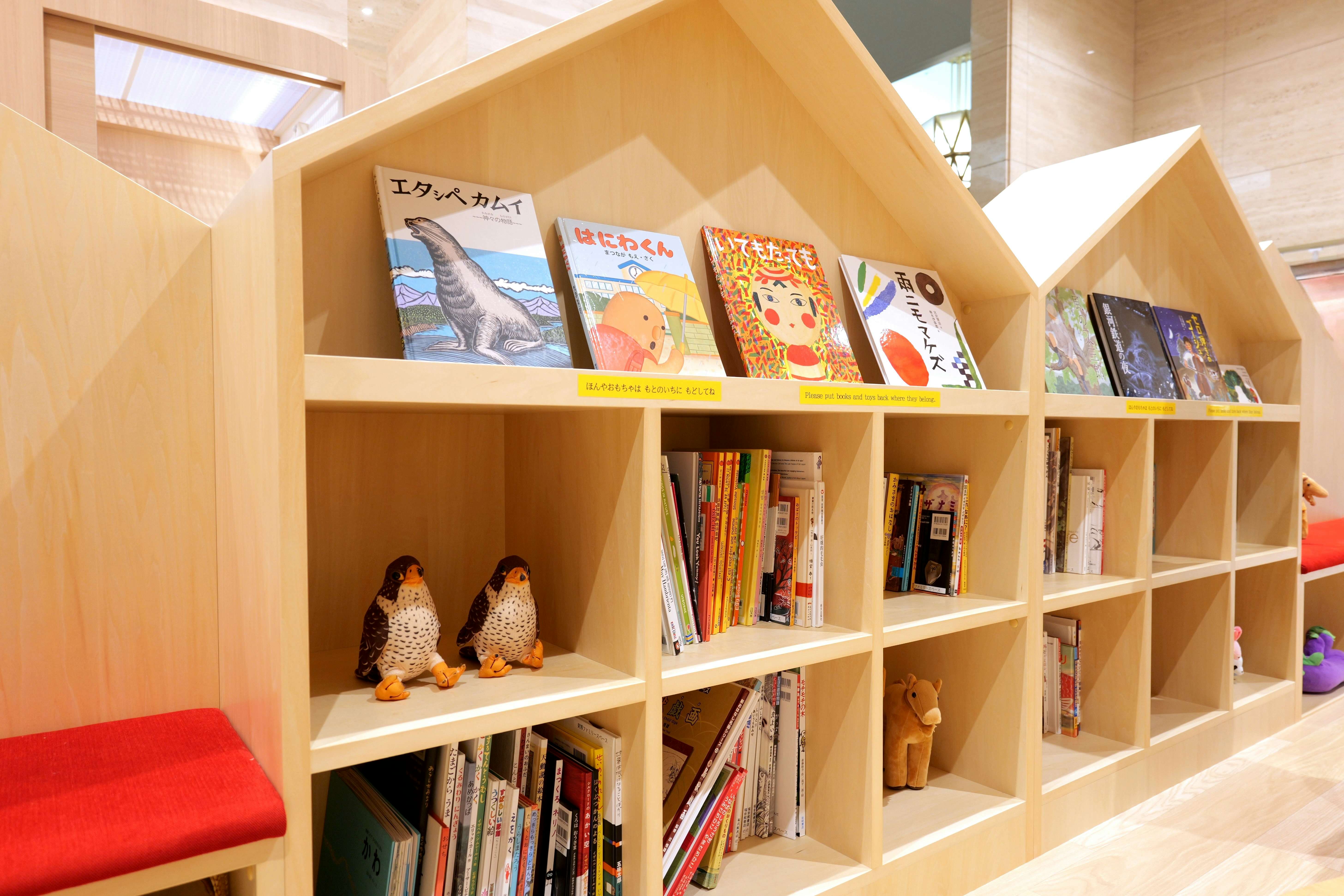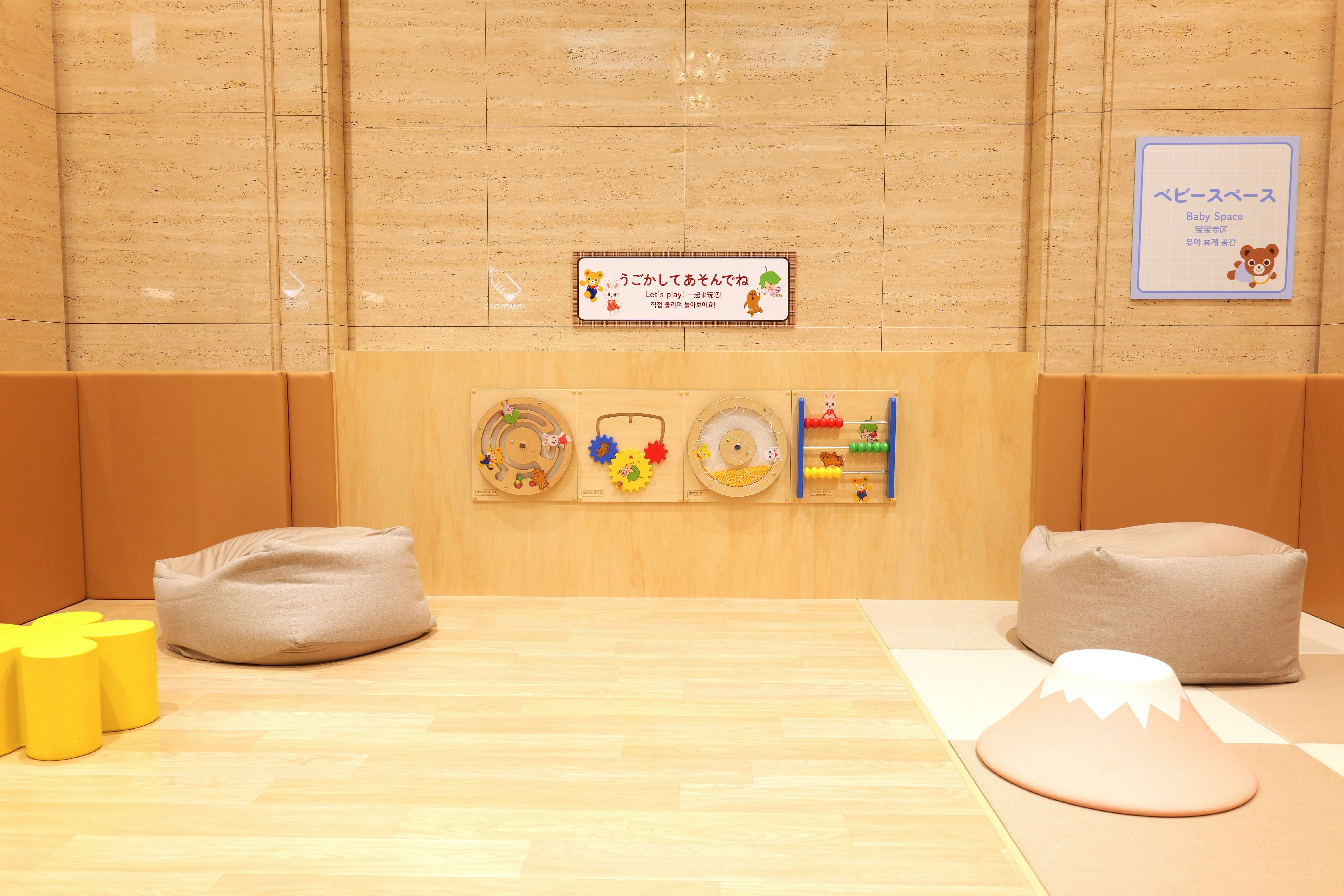 ベビースペースには遊びながら楽しく日本の文化に触れられる環境を用意。えほんコーナーでは「宮沢賢治の絵本シリーズ」を含む約200冊を用意。また、ぬいぐるみや自分で動かして載ることができるクッションなども用意されている。壁面には4種類のウォールトイが設置されるほか、畳の床で、赤ちゃんとゆっくりくつろぐことも可能だ。