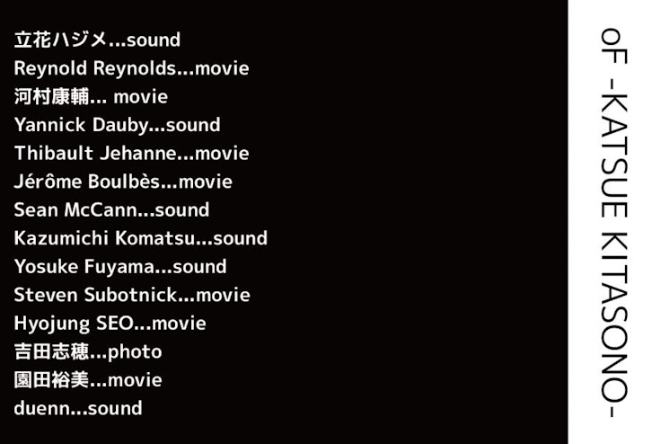 「oF -Katsue Kitasono-」では北園の代表作『単調な空間』(1959)をモチーフに、立花ハジメ、河村康輔、吉田志穂など、電子音楽、メディア・アート、写真などを手がける14名の作家が展示やパフォーマンスを行う。言葉の意味よりもむしろ言葉や文字の形状やパターンを重視した「実験」と呼ばれる詩群のなかの一編であるこの詩を通して、北園の空間認識の真髄に迫る試みだ。