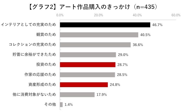 「アート作品購入のきっかけ」については、「インテリアとしての充実のため」が46.7パーセントともっとも多かった。自宅の引っ越しや新築、リフォームなどを作品購入の契機とするコレクターは多く、こうした実情を反映した結果といえる。いっぽうで、約25パーセントが投資や資産形成を目的としていると回答した。