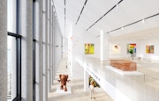 この新本社は、先月同地区内にオープンしたヴィジュアル・カルチャー博物館「M+」の向かい側、22年にオープン予定の香港故宮博物院に隣接する「WKCDAタワー」に位置する。約4500平米の延床面積を誇り、下層のリテール3フロア、上層の展示2フロア、そしてオフィスフロアを含む6フロアで構成。ビクトリア・ハーバーを見下ろす高さ14メートルのガラス窓のファサードを持つ3層構造の空間は、自然光を取り込んで作品を鑑賞することができる。