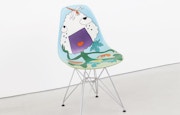 会田誠の《おにぎり仮面》(2002)は、会田の彫刻などで登場する、代表的なキャラクターを椅子に描いた作品。書面入札が逃げ切り、120万で落札。