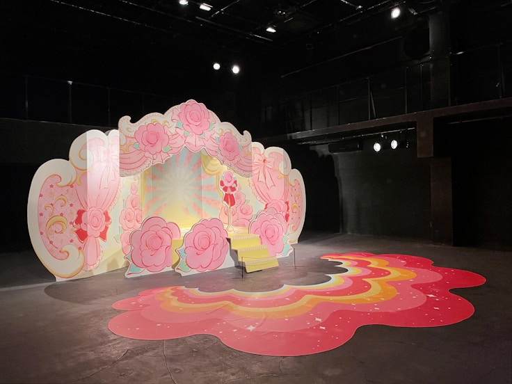 1階のスペースでは、西山美なコ(Yoshimi Arts)が1997年に西宮市大谷記念美術館の個展で発表したステージのようなインスタレーション作品《♡あこがれのシンデレラステージ♡》(1996)を再現。2階で展示されている森公一+真下武久(サードギャラリーAya)のインスタレーション《呼吸する庭》(2024)も印象的だった。ガラスの容器のなかに置かれた植物が光合成によって二酸化炭素を吸収し、容器内の二酸化炭素濃度の変化によって音が奏でられる。また、鑑賞者が作品の前に座ると、その呼吸のリズムに合わせて作品全体が明滅し、植物と人がコミュニケーションしているようなものだ。