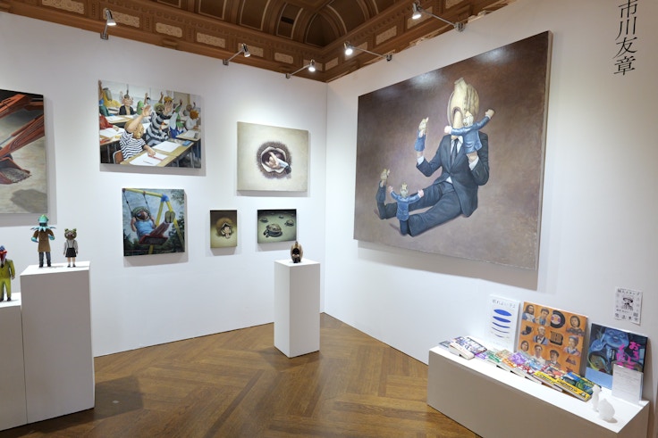 東京の√K Contemporaryは、体は人間、頭はモンスターという異様でどこか懐かしみのある「キャラクター」たちが日常を送る光景を描く市川友章をピックアップ。2011年の東日本大震災を目の当たりにし、自分が特撮映画の世界のなかに投げ出されたような感覚になったという市川。絵画に漂う現代社会への疑義はどこか石田徹也の作品を彷彿とさせるが、市川も石田と同じロスジェネ世代だという。ある世代が共有している社会への問いの表出として見てもおもしろい。