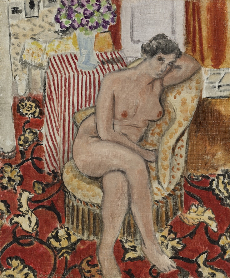 続いて、ピエール=オーギュスト・ルノワール《水浴する女》(1891)は予想750万〜1000万ドルの範囲内で850万ドル(手数料込み1041万ドル/約16億1700万円)で落札。アンリ・マティス《肘掛け椅子の裸婦》(1920)は最低予想額250万ドルを大きく上回る550万ドル(手数料込み679万ドル/約10億5500万円)に達した。