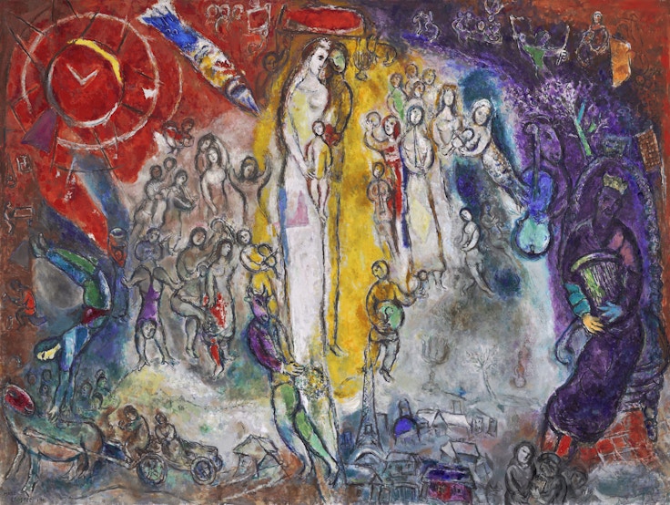 同セールにはマルク・シャガールの2作品も出品された。1966年制作の大作《ダヴィデ王の夢》は、予想800万〜1200万ドルを大幅に超える2200万ドルで落札され、手数料込み2651万ドル(約41億1800万円)に到達。会場では落札直後に拍手が起こった。いっぽう、1949年の《赤い太陽》は予想700万〜1000万ドルの範囲で860万ドル(手数料込み1053万ドル/約16億3600万円)で落札されている。