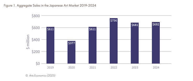 文化庁の委託により発行された最新レポート「The Japanese Art Market 2025」が公表され、2024年の日本アート市場規模が前年比2%増の6億9200万ドル(約1080億円、2026年2月為替レート換算)に達したことが明らかになった。
