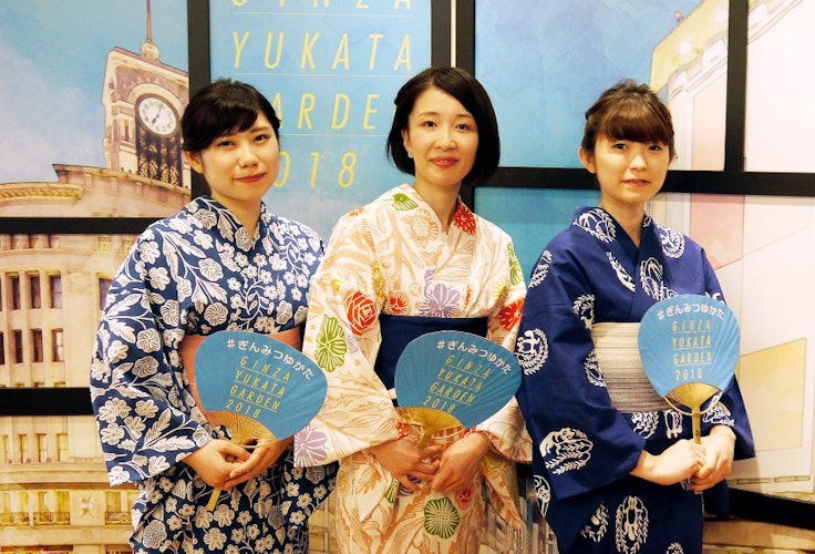 銀座三越では5月16日から8月21日まで、「銀座ゆかたガーデン2018」を開設。5月16日の開店前に、多彩なゆかたを紹介するこのイベントのメディア向けオープニングセレモニーが行われ、社員によるファッションショーなどが開催された。
