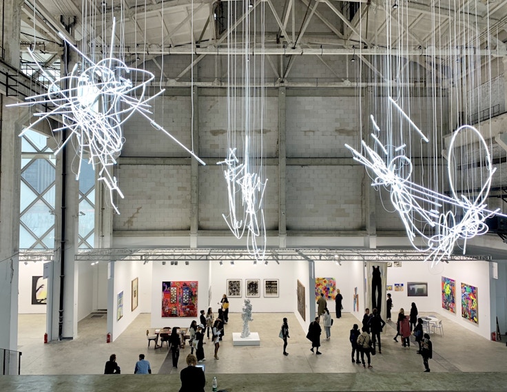 村上は全長18メートルにもおよぶ巨大な龍の作品《Dragon In Clouds - Indigo Blue》をホールNの入り口に展示。青一色で描かれた龍は会場外からも見ることができ、新たなスタートを切ったフェアを祝福するアイコンのようにも見える。