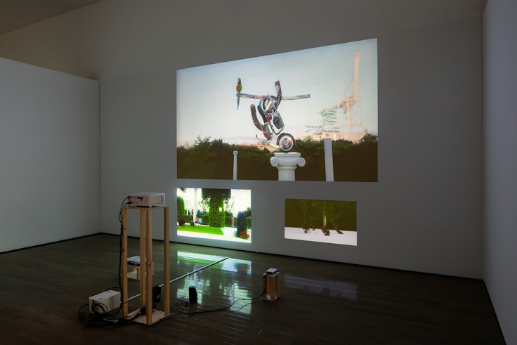 ガトーフェスタ ハラダ賞の平田尚也《庭園》は、3つの画面からなるCGの映像作品。仮想空間の中に、主にインターネットから集めたデータが散りばめられているが、それらは実体を持たないながらも、現実の世界のいたるところに存在する情報の集合体であり、現実世界の断片でもある。そうしたリアルが散りばめられた仮想空間は、その存在や世界が何であるのかを常に我々に問いかけている。