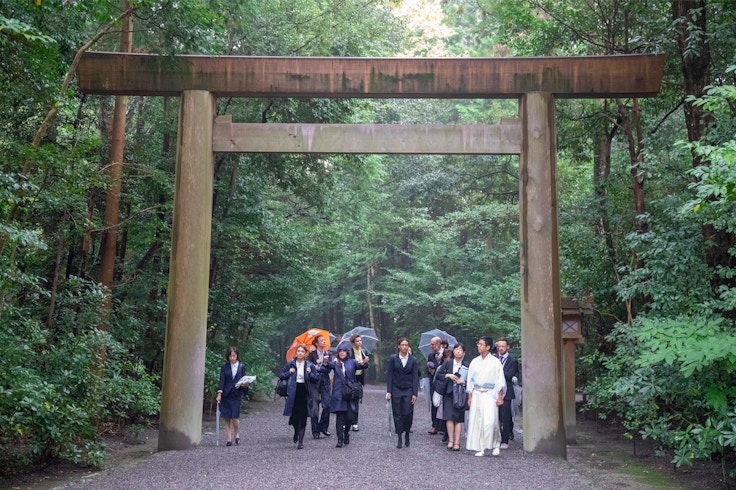 毎年10月に行われる「神嘗祭」は、その年に収穫された新穀を、最初に天照大御神にささげて、その恵みに感謝する祭りである。外宮、内宮それぞれにおいて、午後10時と午前2時に神饌(しんせん)を奉る「由貴大御饌(ゆきのおおみけ)」が行われ、正午には天皇陛下の使者である勅使が幣帛(へいはく)を奉る「奉幣(ほうへい)」が行われる。10月15日午後10時に外宮で行われた「由貴夕大御饌(ゆきのゆうべのおおみけ)」についても、アーティストたちは参拝が許され、儀式へと向かう参進の様子を厳かな気持ちで見守った。