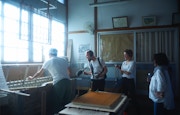1899年の創立以来、伊勢神宮に納めるための神宮御用紙を奉製してきた伊勢和紙の老舗「大豐(たいほう)和紙工業」へ。御用紙は、用途に応じて透かしがすき込んであり、御神札(おふだ)や御守りなどに用いられる。和紙の原料は楮(こうぞ)や三椏(みつまた)と呼ばれる植物の樹皮。今回は、樹皮から不純物を取り除き、水の中に分散させた繊維を、簀桁(すけた)と呼ばれる道具で1枚1枚すくい上げ、乾燥させる工程を見学した。