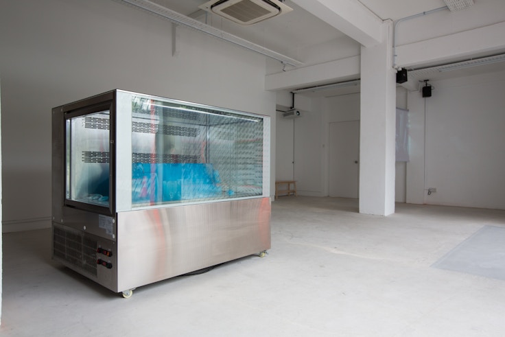 胡昀(フー・ユン)は、《Carving Water, Melting Stones》(2019)を発表。同作は、映像と立体からなる作品。映像では、東南アジアでかつてよく見られたキリストの木彫製作者の故郷・フィリピンのパエテを訪れ、消えていく木彫り師の姿をとらえた。また、映像作品の隣には巨大な冷蔵庫が置かれ、その中にはシンガポールの小学校の生徒たちと協力し制作した、現在のシンガポールの地形に基づいた氷彫作品を展示。それらふたつによって、東南アジアの過去と現在を対話させる。