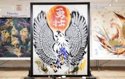 なかでも「見せる」ことをもっとも意識したのが、金屏風を使った作品《天晴れ日本》だ。ガラス張りの正面に置かれた縦1.75メートル、横3.67メートルの金屏風には、男女と鳥をモチーフにした浮世絵スタイルの絵画が描かれ、そのすぐ前には、墨跡を模し3Dにした鉄製の彫刻が吊り下げられている。