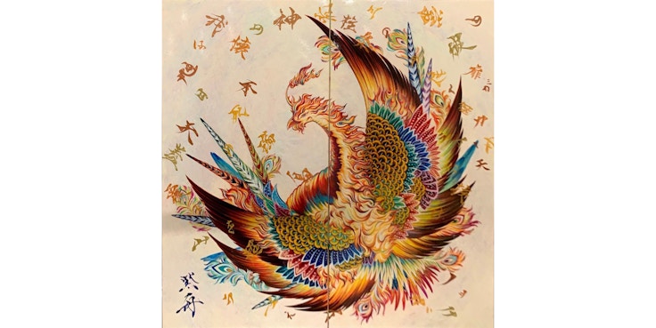 ほかの3点の絵画作品は、「祈り」を表現。紫舟が数年前に「お釈迦様」の教えに興味を持ち、南アジアに何度も足を運ぶなかで得た「学び」から生まれたものだ。「世の中にある『お釈迦様』の絵は当時の御姿を模したもの。そうではなく現在の御姿を瞑想して生まれた」という《御釈迦様》。チベット最奥の聖地カイラス山の上にあると言われる神の扉から飛び出した、山をも超える大きさの火の鳥《ノック・ガラウェイ》。自身が洞窟で祈りを捧げていた際に感じたという南アジアの神様を絵画にした《ナカラー》。