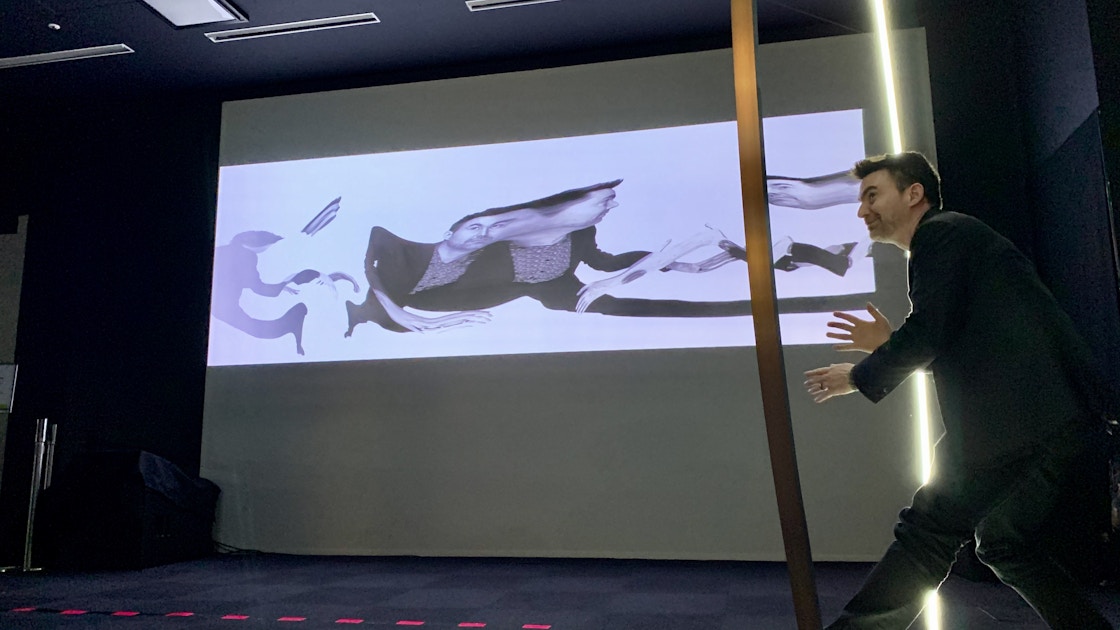 競馬でも用いられるという「スリットスキャン」と呼ばれる撮影技法を用いたこの作品。光のリングをくぐることで画像が残像のようにスクリーンに残り、少し前の過去を映し出す。現実はどんどん過去になっていく、というごく当たり前ながら普段は意識しない事実を、エンターテインメント要素を含む体験型のインスタレーションで提示する。