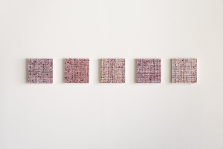 またGALLERY 麟では、油彩をほどこした糸をキャンバス上に無数に弾き、平面を立体に仕上げていく技法で作品を制作することで知られる横溝美由紀の「line」シリーズの紫色系を展示する。限られた矩形のキャンバスには、糸の痕跡が複雑に絡まり合い、次第に新たな空間を浮かびあがらせる。