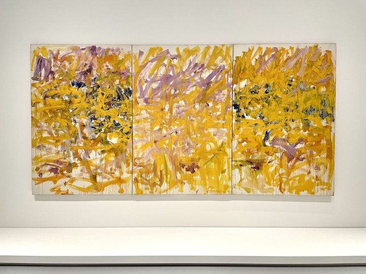 本展は、ジョアン・ミッチェルの巨大絵画2点と、31個ものパーツからなるカール・アンドレの彫刻作品1点によって展示が構成されている。ミッチェルの絵画は、全長4メートルの三連画《Untitled》(1979)と二連画の《Cypress》(1980)。ともに黄色を中心に色数を抑えながらも、力強い筆致がエネルギーを感じさせる作品だ。その作品からは、ミッチェルが尊敬していたというヴァン・ゴッホの影響も感じ取れるだろう。