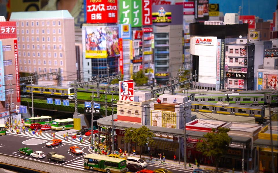 6人で3か月かけて制作された新宿駅のジオラマは、ビルの広告や構造物の凹凸などディティールまで細かに再現されている。