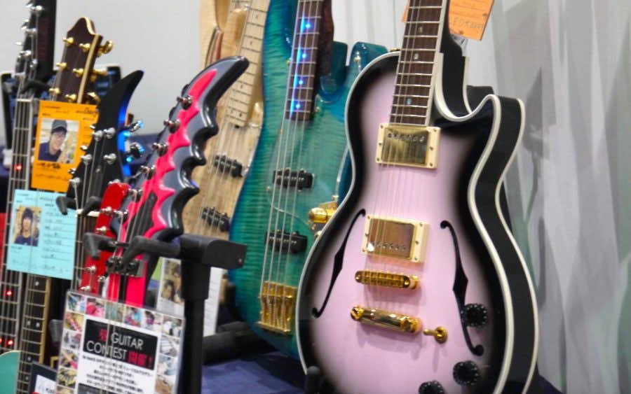 また、ミュージカル・アカデミーではギタークラフト科の学生が制作した個性的なギターを展示。