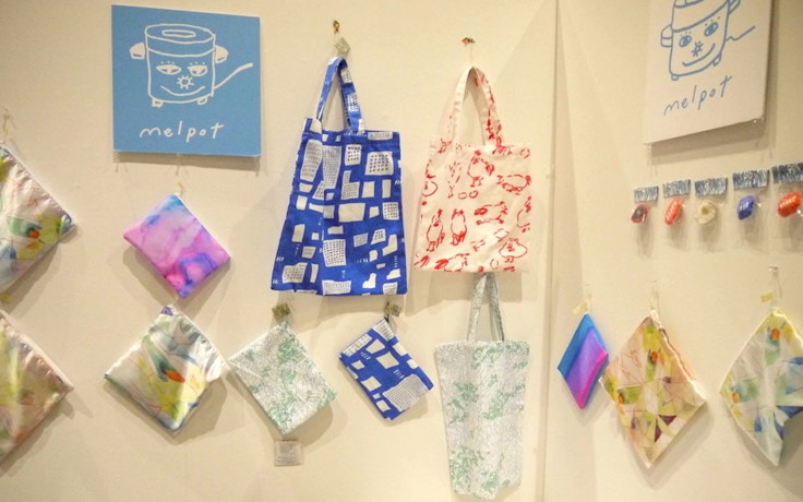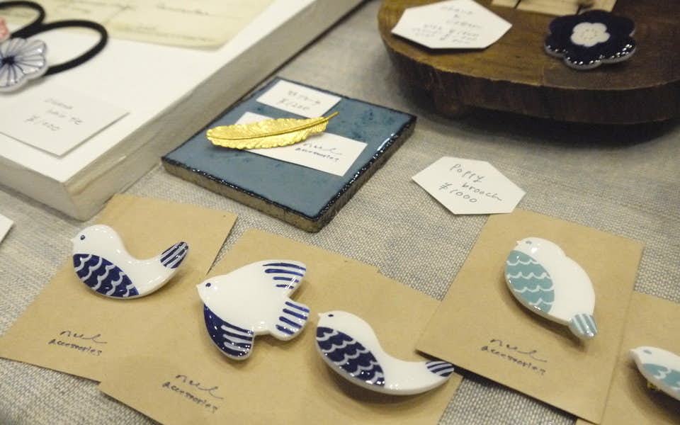 ショーステージの音楽が鳴り響く会場に入ると、入口付近にキャンパスブースが現れます。ひときわ賑わう大きなテーブルは文化学園大学。ブローチやピアス、ブレスレットなどのアクセサリーがところせましと並びます。どれも単価は数百円。そのほかZINEやポストカード、トートバッグ、DVDなど学生ならではの初々しい作品も。