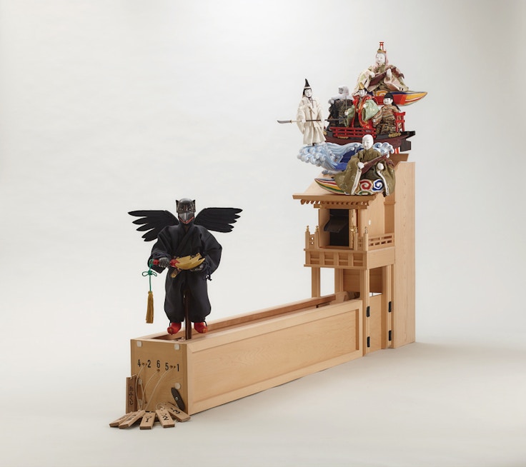 山車からくり人形は、江戸時代の町人文化が華開いた曳山の祭り「山車祭り」の山車に載せられた人形に仕掛けを施したもの。 会場には、七代目が復活させた『かまきり』や、近年の作『鵺』や『二福神』などが並ぶ。