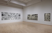 展示冒頭の山がモチーフの作品から、『魔の山』に現在の私たちの社会状況を重ねた作品、また、後半に展示されているオリンピックや東京の景色をダークに描写した作品など、大型の作品の展開に圧倒される。色々な場面で生じる違和感が風間の制作の原動力となり、それが力強い版画のモノクロに昇華していることが伝わってくる。