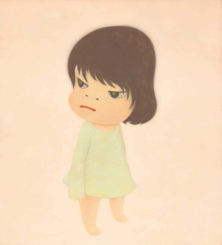 奈良美智のキャンバス作品のなかでも、オークションに出品されることのない希少な作品《Missing in Action》が8日イブニングセールの注目作品だ。制作年の2000年は奈良が12年間のドイツでの修行生活を終えて帰国した年であり、アメリカで初の美術館個展をシカゴ現代美術館とサンタモニカ美術館で開催したターニングポイントでもある。また、同年に描かれた作品《Knife Behind Back》は、2019年のオークションにて2490万ドル(約27億円)で落札され、日本人アーティストとしてはオークションにおける過去最高額を記録した。