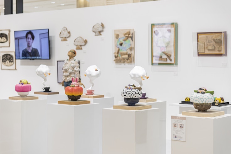 会場中央にあるのは、間伐材を利用してつくられた大きな台座の上に立つ《stew(シチュー)》。今回、「Think GREEN」とのコラボレーションのために制作された4点のうちのひとつが、いち早く展示された。この作品を制作した経緯について、野原は次のように語ってくれた。 「僕は北海道で生まれ育ちました。シチューをモチーフとしたのは、寒さが厳しいこの場所だからこそ、もっとも美味しいと感じられる食べ物ではないかと考えたからでした」。