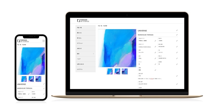 「TERRADA ART STORAGE ONLINE」は作品登録と管理ができる無料のコレクション管理サービスと、1作品単位で保管利用できる有料のサービスで構成。所有している美術品を1点ずつ撮影することで作品をマイページに登録でき、いつでもコレクションを一覧で確認できるうえ、保管品の取り出しや閲覧だけでなく作品データベースとしても活用できる。