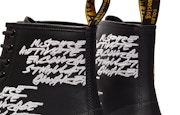一足目の「1460 FUTURA EMB」ブーツはFUTURAのアートにおけるルーツを讃えるデザイン。黒のナッパレザーでつくられたアッパーに白の大胆なコントラストの刺繍によって、FUTURAの反抗的なグラフィティアートが織り込まれており、ソールとステッチは、グラフィティを引き立たせるようにモノトーンでシックに仕上げられている。