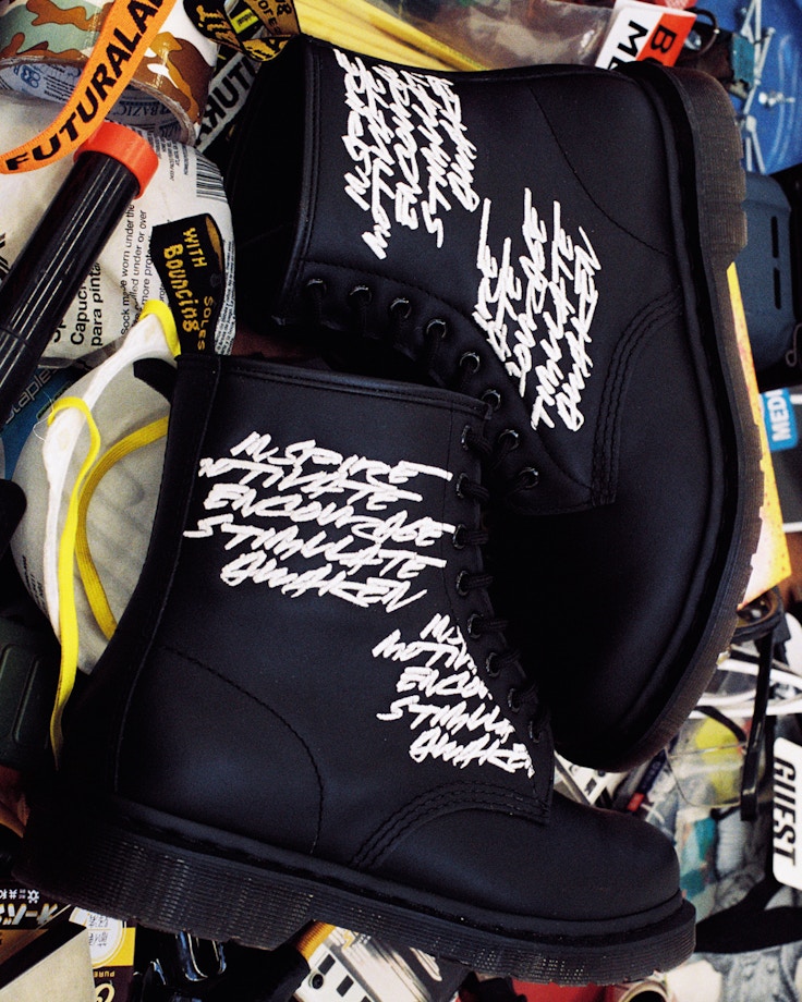 今回のコラボレーションは、FUTURAのデザインスタジオおよびブランドである「FUTURA LABORATORIES」とのパートナーシップにより実現したもの。ドクターマーチンの精神を体現し、パンクな姿勢のオマージュとして革新的なひねりを加えた、異なるデザイン2型の1460 8ホールブーツが誕生した。