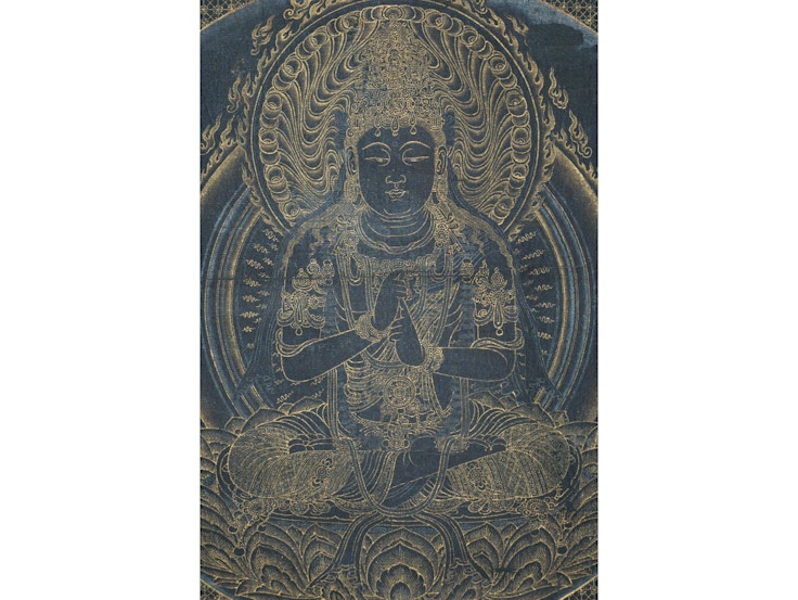 《紺地金銀泥両界曼荼羅図》は密教の世界を表す金剛界と胎蔵界からなる一対の曼荼羅だ。紺色の絹に金銀泥を用いて描いた希少な作例で、図様は良好な状態で残されている。しかしながら、画面全体に横方向のきつい折れなどが生じているため、表装を解体して裏打紙をすべて取り替える本格修理を実施する。